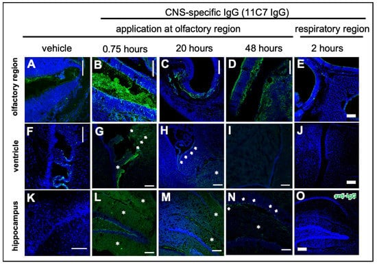- Kumar, N.N.; Lochhead, J.J.; Pizzo, M.E.; Nehra, G.; Boroumand, S.; Greene, G.; Thorne, R.G. Delivery of immunoglobulin G antibodies to the rat nervous system following intranasal administration: Distribution, dose-response, and mechanisms of delivery. J. Control. Release 2018, 286, 467–484. [Google Scholar] [CrossRef] [PubMed]