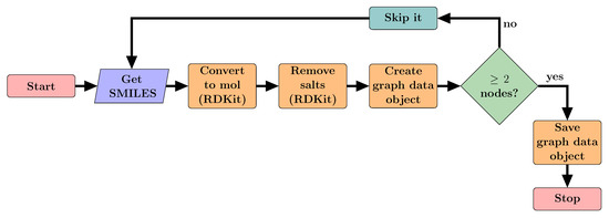 Each of the drug molecule’s SMILES string was converted into an RDKit [10] molecule object. RDKit’s salt remover was then employed to remove salts, hence avoiding the mistake of keeping multiple versions of drug molecules that only differ because of the attached salts. From the resulting molecule object, we extracted the following information for each atom: atomic number, chirality, degree, formal charge, number of attached hydrogen atoms, number of radical electrons, kind of hybridization, whether it is aromatic, and whether the atom is in a ring. For bonds, we obtained the type, stereo, and whether a bond is conjugated or not. This information was then used to create a graph in which the nodes were atoms and the edges were the bonds. The node and edge features were, respectively, the atom and bond information described earlier. This way of encoding node and edge features is similar to that deployed in PyTorch Geometric, PyG [18], DeepChem [19], and GraphDTA [20]. PyG was used to create and save graph data objects. All graphs with fewer than two nodes were removed from the dataset as it would be difficult to use edge information from graphs with single nodes. Figure 1 shows a flow chart for this process.