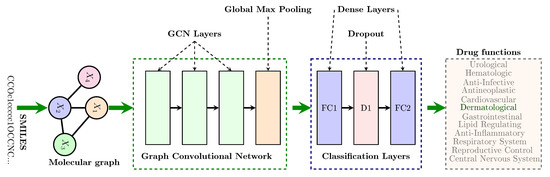 Figure 2 shows the architecture of our basic model. As illustrated in that figure, SMILES (Simplified Molecular Input Line Entry System) [21] strings representing drugs are converted into molecular graphs. These graphs are then fed to the model to learn a latent representation vector for each drug in the graph convolution network block. In that block, each GCN layer subblock comprises a GraphConv layer, a Rectified Linear Unit (ReLU) activation function, and a GraphNorm layer, respectively. The latent vector, chosen to be of length 1024 after some experimentation, is subsequently pushed through the classification layers to predict the class to which a drug belongs. We used the log softmax activation at the output of FC layer 2 and applied the negative log likelihood loss for classification in the single label tasks. In the multi-label classification tasks, the log softmax layer was not included and a multi-label soft margin loss was applied. All these activation and loss functions are implemented in PyTorch [22].
