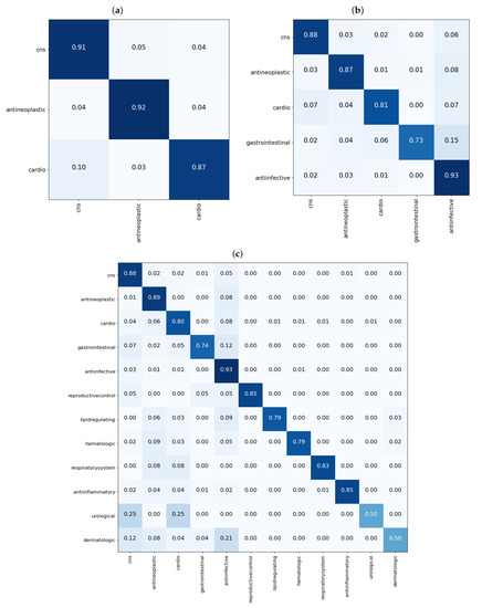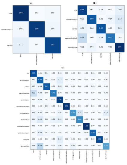 In the 12-task subgroup, the respiratory system agents class was perfectly predicted at , as shown in the confusion matrix of Figure 5c. This was also the smallest group in the test data with just eight drug compounds. The urological agents were the overall smallest dataset, with 10 drugs in the test set and 26 drug compounds used in cross validation (Table 1). However, the model correctly predicted of the test drugs in this class (Figure 5c).