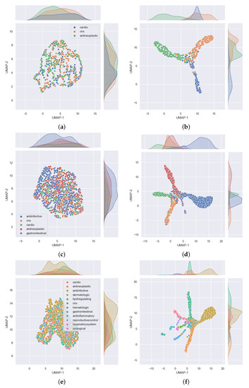 Figure 6a shows the distribution of the data that was used for testing in the three-task subgroup. It is observed that the drugs in each class are fairly evenly distributed on both axes without any conspicuous outliers, but there are many more antineoplastic agents (342) as there are cardiovascular (152) and central nervous system (176) agents. After passing this data into our model, the model classifies the drugs into the three MeSH classes and the majority of these appear closer to each other in the 2D space, as shown in Figure 6b.