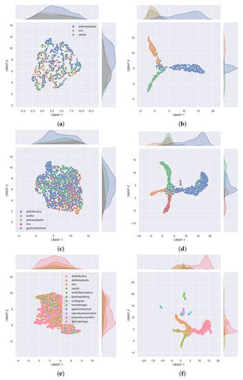 Figure 6c reveals that the distribution of the data used for testing was evenly dispersed, but there were big disparities in the number of drugs among the classes. In particular, there were about 776 anti-infective agents in contrast to 46 gastrointestinal agents. This disparity is also well depicted in Figure 6d, which shows five noticeable MeSH classes in which drugs belonging to each class appear closer to each other after the model correctly classified the majority of the drugs into their respective classes.