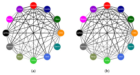 Networks of multi-label classification on the test dataset. The connections as given by true class labels are shown in (a) while those predicted by the model are shown in (b). In each of these subfigures, the thicker the edge the higher the frequency of co-occurrence of nodes. There are seven edge types that appear in the network of predictions that do not appear in the network of true class labels. These are urological–dermatological, antineoplastic–dermatological, respiratory–urological, anti-inflammatory–dermatological, anti-infective–dermatological, cardiovascular–dermatological, and respiratory–dermatological. Such new edge types show the obvious misclassifications made by the model. Other misclassifications are more subtle and can be seen by the widths of the edges. We have provided the list of edge counts for that case in the Supplementary Material. Networks in this figure were drawn using NetworkX [28].
