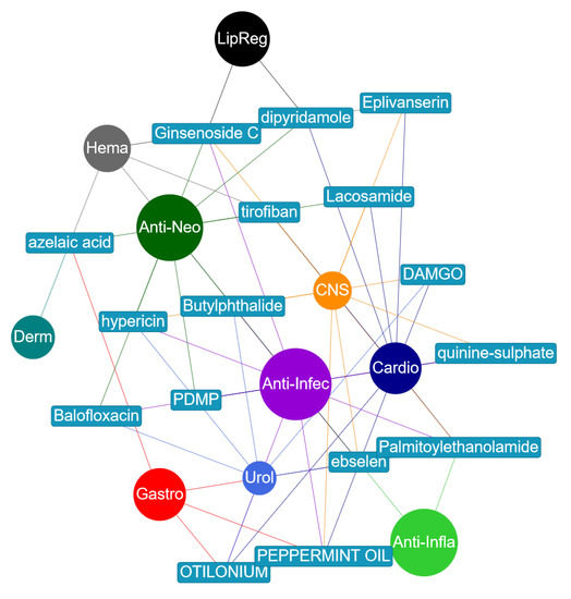 Palmitoylethanolamide (PEA) was given as an anti-infective, an anti-inflammatory, and a CNS agent. The model predicted it as also being a cardiovascular agent. It was reported in [45] that PEA evokes potent anti-inflammatory effects in cultured macrophages which translates under in vivo conditions into a strong atheroprotective effect. In addition, based on the clinical studies for testing PEA to treat pain and inflammation that were going on at the time, PEA was thought to be an interesting novel therapeutic drug for patients with cardiovascular disease. Similarly, research results reported in [46] indicate that PEA combined to polydatin protects against cardio and vasculotoxicity of doxorubicin by promoting an anti-inflammatory phenotype, representing a new therapeutic approach to resolve doxorubicin-induced cardiotoxicity and inflammation. We have not yet found information that confirms whether PEA could be a urological agent.