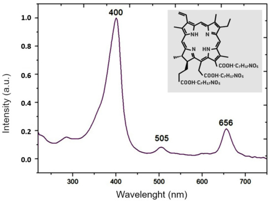 Chemical structure [25] and absorption spectrum of Fotoenticine (200 μg/mL in 0.9% NaCl) determined with a spectrophotometer (DS-11, Denovix, DE, USA).