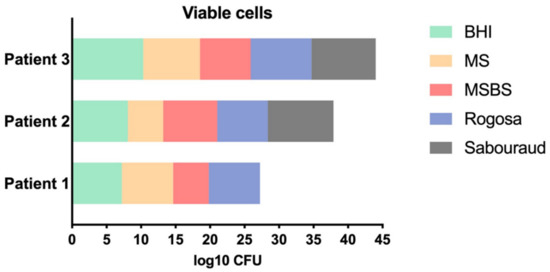 The microcosm biofilm obtained from patient 3 (10.31 log10 CFU) showed the highest total microbial count, followed by patient 2 (8.09 log10 CFU) and 1 (7.21 log10 CFU). In the three patients analyzed, the results were superior to those found by Mendéz et al. [24], who obtained a total microbial count of approximately 6.5 log10 CFU in the microcosm biofilms from dentin caries of children. Possibly, these differences can be attributed to the age of patients because in our study, only adults were included. However, Rudney et al. [32] did not observe differences in the quantity of microorganisms between adult and pediatric patients when microcosm biofilms were formed from saliva or dental plaque. The total microbial count ranged from 8 to 10 log10 CFU, independently of the inoculum source. Although the quantity of microorganisms formed in microcosm biofilms can vary depending on the study in the literature, it is evident that the microcosm model is able to provide very dense biofilms that can be useful for a large number of in vitro studies.