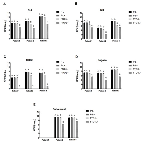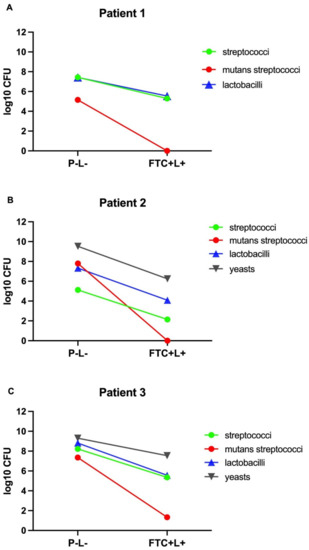 Considering the biofilms of all patients, the mean of microbial reductions achieved by FTC-mediated PDT (in comparison to the P − L− group) ranged from 2.1 to 2.8 log10 CFU for streptococci, 1.8 to 3.2 log10 CFU for lactobacilli and 1.7 to 3.2 log10 CFU for yeasts. Interestingly, mutans streptococci had a greater susceptibility to PDT relative to the other microorganisms. FTC-mediated PDT caused a mutans streptococci reduction of 6.02 log10 CFU for the biofilm of patient 3 and a total eradication for patients 1 and 2 (Figure 5).