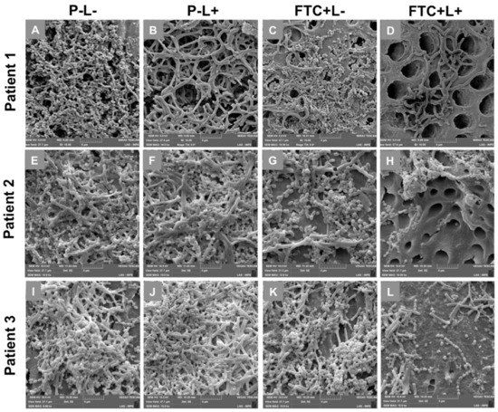 Scanning electron microscopy images according to the groups: treated with PBS in the dark (P − L−), treated with PBS and irradiated (P − L+), treated with FTC in the dark (FTC + L−) and treated with FTC and irradiated (FTC + L+). (A–D) Microcosm biofilm from patient 1. (E–H) Microcosm biofilm from patient 2. (I–L) Microcosm biofilm from patient 3.