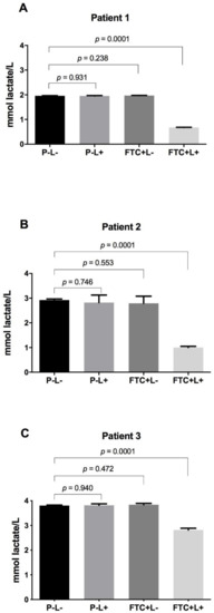 Means and SD of lactic acid concentration (mmol lactate/L) for the groups: treated with PBS in the dark (P − L−), treated with PBS and irradiated (P − L+), treated with FTC in the dark (FTC + L−) and treated with FTC and irradiated (FTC + L+). (A) Microcosm biofilm from patient 1. (B) Microcosm biofilm from patient 2. (C) Microcosm biofilm from patient 3.