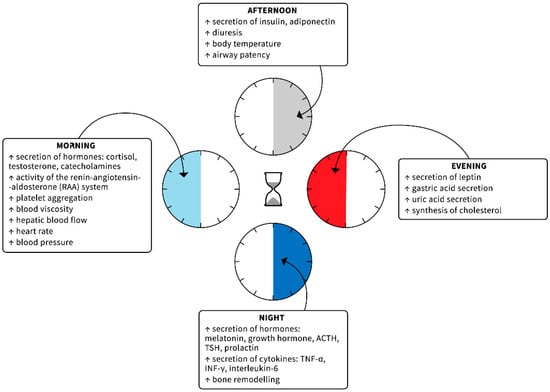 Biological rhythms are characterized by such features as period (duration of one full cycle), mean value (mesor), amplitude (difference between the mesor and maximum value), acrophase (time of reaching the maximum value during one cycle), and nadir (the opposite of the acrophase—time of reaching the minimum value by the rhythm). Taking the period into consideration, we can differentiate the ultradian rhythms, with cycles of varying duration, shorter than 24 h, ranging from one second through several seconds (e.g., oscillations in electroencephalographic recordings, heart rate, respiratory rate) to several hours (e.g., the basic sleep stage change cycle); circadian (“circa”—around; “dies”—day) rhythms, with an approximate duration of 24 h, related mainly to photoperiodism (e.g., sleep–wake rhythm, changes in core body temperature, secretion of selected hormones, changes in arterial blood pressure, and efficiency of the immune system); and infradian rhythms, the cycle of which exceeds 24 h (e.g., weekly, monthly, annual, and even seasonal) [1,2,3,9,12]. Physiological and pathophysiological phenomena controlled by the circadian rhythm are particularly noticeable. They are presented in Figure 1.