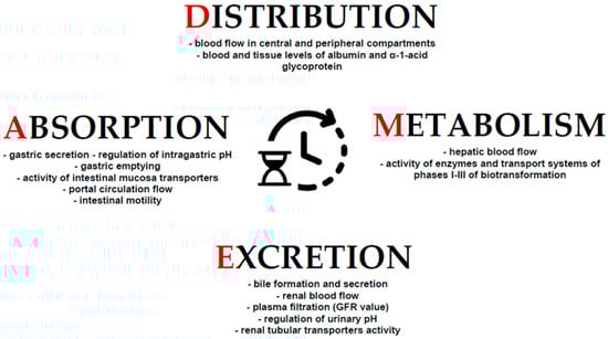 Chronopharmacology is a field of science focusing on studying the effect of biological rhythms on pharmacotherapy, i.e., a branch of pharmacology studying the dependencies between the timing of drug administration and its effect [1,2,3]; it is one of the elements to be taken into consideration in broadly understood pharmacotherapy rationalization in order to ensure its maximum effectiveness and safety. Currently, therapy individualization in specific patients is based on consideration by the prescribing doctor of the age, sex, and individual physio- and pathophysiological conditions (existence of concomitant diseases) to anticipate the potential onset of drug interactions resulting from application of polypharmacotherapy—i.e., the patient’s pharmacogenetic profile (determined by way of evaluation of the phenotypic response to the administered drug or direct genotyping) [4]. The pharmaceutical care system and medicines use review (MUR service) provided by pharmacists also play a supplementary role in pharmacotherapy individualization [5]. Finally, the most optimal solution is implementation of personalized pharmacotherapy in the patient, taking into account the unique traits of the given patient and, additionally, specifying precisely the target for pharmacological intervention resulting from the analysis of the pathomechanism of the given condition [6,7]. The factors to be considered in pharmacotherapy individualization and personalization include also employment of monitoring of drug concentration in blood (Therapeutic Drug Monitoring; TDM) and consideration of the effect of biological rhythms on the pharmacokinetic disposition of the drug in the body and, consequently, on their pharmacodynamic properties [8]. Unfortunately, the issue of chronopharmacology remains a frequently overlooked and poorly studied aspect of therapy rationalization.
