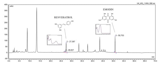 2.2.2. Determination of Resveratrol and Emodin Content in Extracts