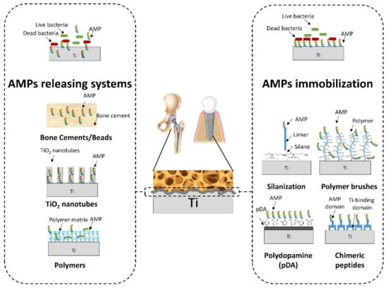 The coupling strategies to obtain, for example, Ti-AMP implants, range from different surface functionalization (e.g., silanization) and subsequent peptide grafting chemistries, to the application of chimeric peptides, or even to the making of AMP-grafted polymeric coatings.