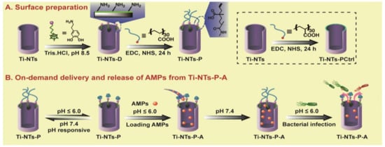 More recently, Chen et al. [61] developed eight HHC36 (1.5 mg/mL)-based TiO2 nanotube systems with a switchable response dependent on bacterial presence (smart releasing coating) (Figure 2). To this end, the surface of the TiO2 nanotubes was firstly modified with dopamine, whose amine groups were covalently linked to carboxyl groups of poly(methacrylic acid) (PMAA) (Figure 2A). PMAA is a pH-sensitive polymer that collapses at pH < 6, allowing the opening of the “gate” of nanotubes. Therefore, AMP loading was performed starting at low pH and then rising it up to 7.4 (physiological environment), to promote the swelling of PMAA and consequent encapsulation of the AMPs, by “gate closure”. In other words, at this pH, the nanotubes remain closed, acting as an AMP reservoir capable of extending the release time from dozens of hours up to 10 days [61]. When bacterial infection occurs in the implant, pH in its vicinity drops below 6, leading to collapse of PMAA, i.e., to the opening of the “gate”, hence triggering rapid release of the AMPs from the nanotubes for immediate bacterial killing (Figure 2B).