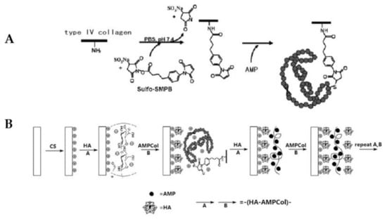 Schematic representation of Chitosan and Hyaluronic Acid Layer by layer coating production embedding an AMP-collagen IV conjugate. (A) Synthesis of AMPCol; (B) CS-(HA-AMPCol) layer by layer coating production. Adapted with permission from reference [64].