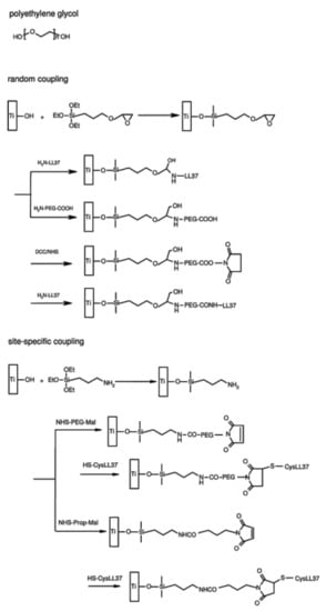 Gabriel et al. were the first authors to describe silanization as a method of covalent binding of AMPs onto Ti. In this work, a Ti surface pre-treated with piranha solution was silanized with 3-aminopropyltriethoxysilane (APTES) or glycidyloxypropyl triethoxysilane (epoxy silane) to compare chemoselective (by either its N- or its C-terminus) to random coupling of the AMP (human cathelicidin LL-37, 0.5 mg/mL). These authors also tested the introduction of a polyethylene glycol (PEG) spacer instead of direct coupling [98] (Figure 4).