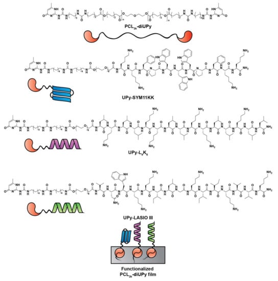 Another example of a supramolecular assembly-based strategy regards the functionalization of silk proteins with either a fibronectin-binding motif (for cell adhesion) or Magainin I (for antimicrobial activity). The obtained conjugates were capable of forming non-covalently linked coatings on top of different materials (e.g., Ti, HAp) resistant to washing procedures. The reported high level of biocompatibility with fibroblasts and endothelial cells was promising, although the moderate antimicrobial activity against S. aureus prompts for further optimizations [116]. Similarly, Zaccaria et al. [117] developed a multi-functional ureido-pyrimidinone (UPy) based supramolecular polymer that was further conjugated with AMPs (SYM11KK, L9K6, or LASIO III) (Figure 5). These supramolecular polymeric materials allowed deposition and self-organization in a film.
