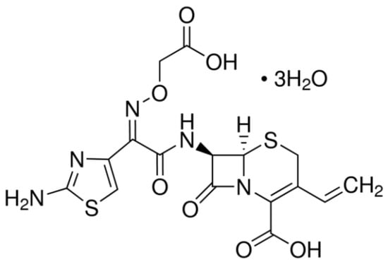 Cefixime (CEF) (Figure 1) is a third-generation cephalosporin considered essential for children up to 12-years old, being included in the WHO Model List of Essential Medicines for Children among the ‘Watch group antibiotics’ and recommended as essential second choice treatment for gastroenteritis and colitis without specification of infectious agent [1]. CEF is also active against β-lactamase-producing bacterial strains that provoke respiratory tract infections (e.g., acute bronchitis, pharyngitis and tonsillitis), otitis media, uncomplicated urinary tract infections and gonorrhea [2].