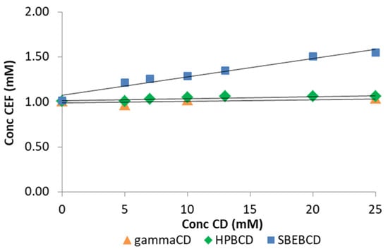 Figure 2 shows the phase-solubility diagrams of CEF in aqueous CDs solutions. CEF solubility slightly increased linearly only in the presence of increasing SBEβCD concentration, giving rise to an AL-type phase solubility diagram [37] with Kst ≈ 20 M−1, indicative of the formation of weak water-soluble complexes with possible 1:1 stoichiometry (Table 1). The low value of the Kst, as well as the limited CEF solubility increase (about 1.5 times), were in perfect agreement with that reported in literature [30].