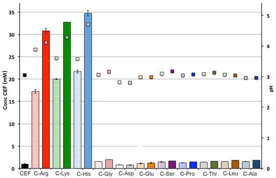 This finding can be reasonably ascribed to the acidic nature of the drug and the basic properties of such AA, and thus to a CEF salt formation, clearly more soluble than the drug as such. The improved solubility of various acidic drugs by the use of basic AAs as counterions has been already reported [32,53] A concomitant pH increase from the initial value of 3 (for the drug alone suspension) up to values of 4.1, 4.3 and 4.7 in the presence of l-Arg, l-Lys and l-His, respectively, was also pointed out.