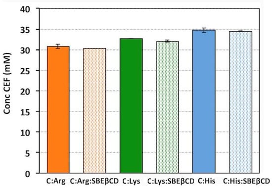 Based on these results, solubility studies of ternary mixtures CEF:basic AA:SBEβCD (1:2:1 mol/mol) were then carried out, in order to evaluate if their combined use could have a synergistic effect on CEF solubility enhancement. In fact, it has been shown that the addition of suitable auxiliary substances can improve the cyclodextrin solubilizing and complexing properties due to the formation of a multicomponent complex [54,55]. Unlike that expected, CEF solubility in ternary mixtures was very similar to that obtained in the presence of the basic AA alone, showing no additional effects due to the joined presence of CD and resulting even lower than the theoretical one calculated as the sum of CEF solubility in the presence of SBEβCD and amino acid separately (Figure 4).