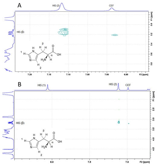 2-D ROESY experiments were performed in order to gain further insight into the possible interactions between the components in binary and ternary systems. Figure 5A,B shows the spectra related to the ternary CEF:His:SBEβCD system, where intermolecular cross peaks, due to nuclear Overhauser effect (nOe) between the protons of CEF and the α and β protons of His were observed, thus demonstrating the interactions between the two molecules. On the contrary, no interactions between His and SBEβCD or CEF and SBEβCD were detected in the ROESY spectrum of the ternary system. An interaction was instead observed in the ROESY spectrum of the solution containing only SBEβCD and His, as proved by a nOe signal between the protons of the amino acid heterocycle (1 and 2) and the butyl protons of SBEβCD (Figure 5C), thus confirming the MD findings.