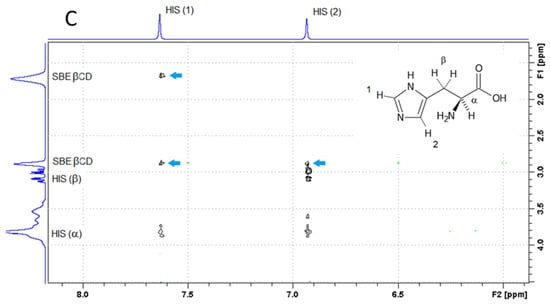 2D ROESY spectra of ternary CEF:His:SBEβCD (A,B) and binary His:SBEβCD (C) solutions.