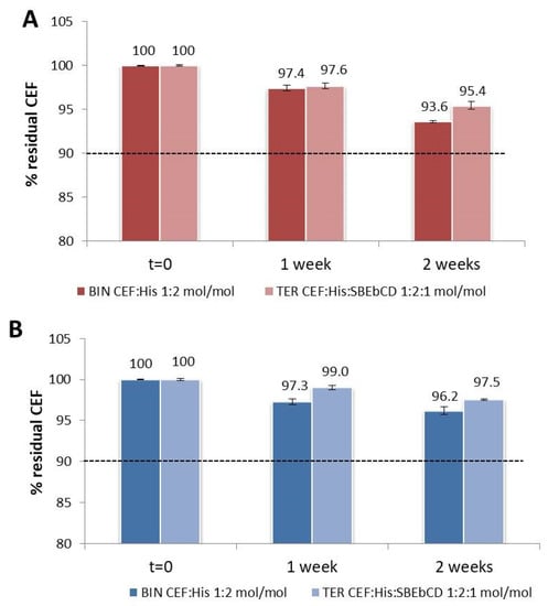All the prepared formulations remained stable during the two weeks in terms of residual drug%: in fact, it was in all cases higher than 90%, which is the limit of drug labeled potency currently accepted for pharmaceutical dosage forms. Storage at 4 °C slightly, but not significantly (p > 0.05), delayed the CEF degradation rate if compared to room temperature. Moreover, ternary systems-based formulations always showed % residual concentration values a little, even if not significantly (p > 0.05) higher than the corresponding binary system-formulations, thus indicating a certain stabilizing power of SBEβCD. In fact, the ternary system formulation stored at 4 °C was the only one whose residual drug content was not significantly different from t = 0 after two weeks of storage.