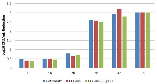 The results of the time-kill kinetics showed that both Cefixoral® suspension and binary (CEF-His) and ternary (CEF-His-SBEβCD) solutions gave rise to similar killing kinetics that reach a complete killing (Log10 CFU/mL reduction > 3) after 5 h (Figure 8), confirming the bactericidal activity of CEF in E. coli [63].