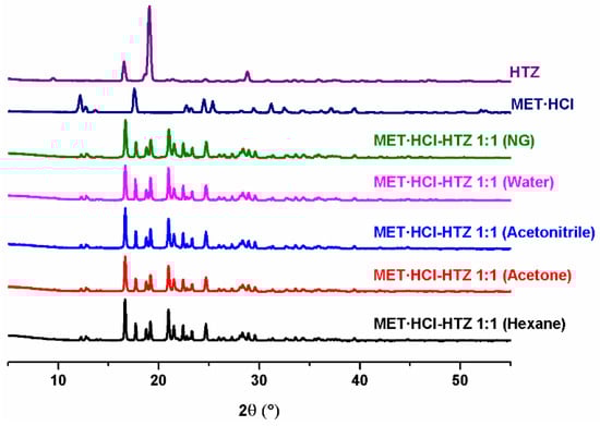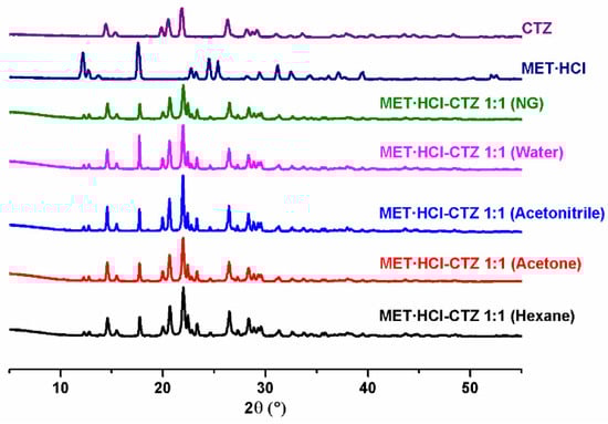 The preparation of the solid forms was performed by ball-milling of MET·HCl with CTZ or HTZ (1:1) using neat grinding (NG) or liquid assisted grinding (LAG) [,,,,]. In LAG, a solvent-screening, varying their polarity, was carried out using different solvents, such as hexane, acetone, acetonitrile and water, in order to explore their effect in the formation of new solid phases []. Then, all the products were analyzed by PXRD.