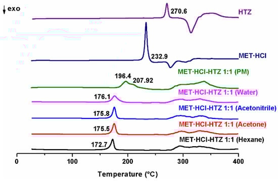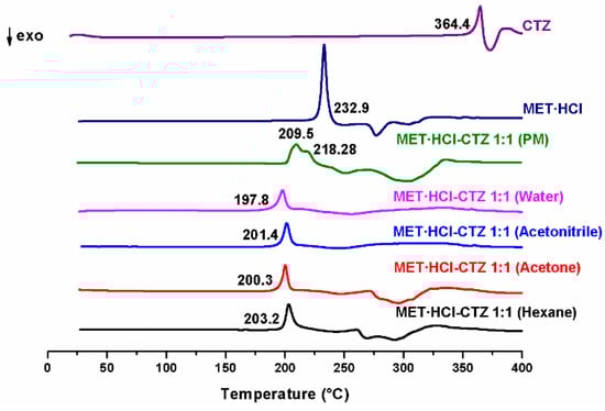 The products obtained through the LAG solvent-screening were also analyzed by DSC. PMs were prepared combining MET·HCl with HTZ or CTZ in a 1:1 stoichiometric ratio, and analyzed by the same technique. Figure 3 shows the DSC scans of the pure APIs and those of the different outcomes for MET·HCl-CTZ 1:1, where one can easily observe the appearance of a single endothermic event, showing a considerable reduction in the Tfus (197.8–203.2 °C) compared with the parent APIs. In addition, for the PM the endothermic event exhibits two overlapped peaks (209.5 and 218.28 °C), clearly indicating that the different products obtained on the LAG solvent-screening are not PMs, since they only exhibit a single endothermic peak and not separated melting events for the individual components [].