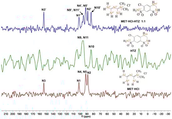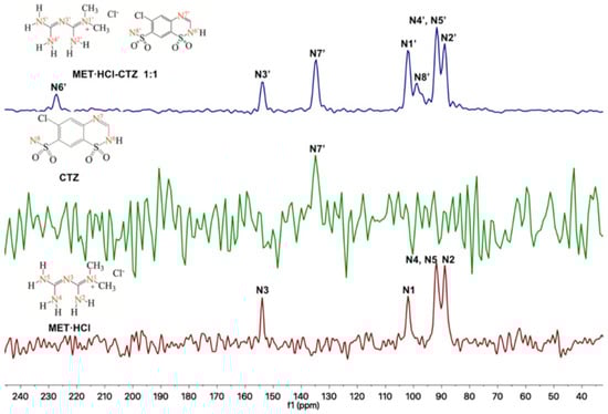 Regarding the 15N-SSNMR experiments, for the APIs MET·HCl, CTZ or HTZ and the solid forms of MET·HCl-CTZ 1:1 or MET·HCl-HTZ 1:1 (Figure 7 and Figure 8), no significant Δδ were observed (Table 2). This fact indicates that there is no formation of heterosynthons and homosynthons are preserved intact.