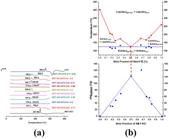 Thus, binary diagrams (Figure 9b and Figure 10b) were constructed, plotting the solidus and liquidus points (Tonset) against the mole fraction of MET·HCl (χMET·HCl) at all examined compositions (Supplementary Tables S3 and S4, SM†). Tammann’s triangle diagrams were plotted using the enthalpy of fusion (ΔHfusion) against the mole fraction of MET·HCl [,]. For more clarity, Figure 9a,b and Figure 10a,b can be observed in an enlarged form in the SM (Supplementary Figures S5 and S6, SM†).