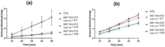 IDR experiments for the solid forms at different compositions: (a) MET·HCl-CTZ and (b) MET·HCl-HTZ. Error bars represent the standard deviation.