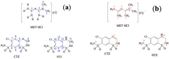 Thus, when monotherapy is no longer efficient for T2D, the simultaneous utilization of two or more drugs depending on the clinical profile of the patient seems to be a more appropriate approach [,]. Metformin hydrochloride (MET·HCl) is considered by far as the first-line drug of choice due to several benefits for the treatment of T2D, i.e., low cost and the fact that it is the only antidiabetic drug that has conclusively shown prevention in cardiovascular diseases and has provided beneficial effects on dyslipidemia and hypofibrinolysis []. On the other hand, thiazide drugs are referred as the diuretics of choice for the treatment of hypertension [,]. Despite the wide utilization of thiazide diuretics on the treatment of hypertension, their use has been related with the increase in the risk of new-onset diabetes [].