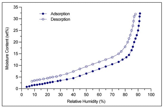 Water vapor adsorption and desorption isotherm curve obtained at 25 °C by Quali-V-I Extra Dry capsules (Qualicaps®, Tokyo, Japan). These data are obtained by means of a volumetric method as per USP41<1241> All data were obtained [33], https://ondrugdelivery.com/quali-v-extra-dry-a-novel-capsule-for-delivering-hygroscopic-pharmaceutical-drugs, accessed date: 5 October 2021.
