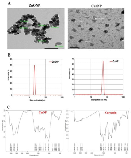 Characterization of ZnONP and CurNP. (A) TEM analysis of nanoparticles. (B) The particle size of nanoparticles. (C) FTIR analysis of curcumin and CurNP. (D) FTIR analysis of ZnONP.