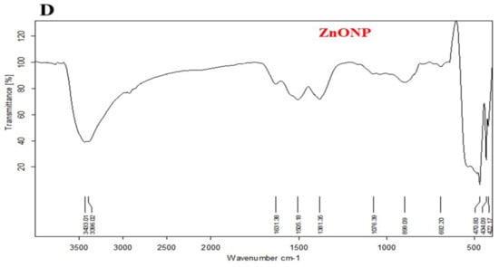 TEM analysis displayed that ZnONP had a diameter between 11 and 22 nm while CurNP had a diameter between 44 and 52 nm and both nanoparticles had a spherical shape (Figure 1A). Additionally, the particle size of ZnONPs and CurNPs (Figure 1B) was 21.00 nm and 58.80 nm, respectively, confirming the results obtained from TEM analysis. Where the PDI was (0.201 ± 0.01) for ZnONP and (0.141 ± 0.01) for CurNP. CurNP and curcumin FTIR spectra were measured in the region of 4000–400 cm−1. The stretching vibration of hydrogen-bonded OH found in curcumin correlates to the intense band at wavenumber 3508 cm−1. The frequency of aromatic CH was determined to be 1628 cm−1. The aromatic stretching vibrations of the benzene ring are represented by 1427 cm−1. The intense characteristic band centered at 1507 cm−1 represents the stretching vibration of the conjugated carbonyl (C=O). The stretching vibration of hydrogen-bonded OH observed in nano curcumin corresponds to the broad, strong band at wavenumbers 3268 and 3268 cm−1. The stretching vibrations of the benzene ring are shown by bands at 1455 and 1430 cm−1. The characteristic band centered at 1513 cm−1 represents the stretching vibration of the conjugated carbonyl (C=O). Stretching vibrations of C=C bonds are shown at 1598 (Figure 2C). The chain absorption peaks in the FTIR spectra of ZnONP were 400 and 4000 cm−1. The C=C stretch of alkenes or the C=O stretch of amides is represented by the absorption peaks at 1631, 1505, and 1381 cm−1. Stretching vibrations of the C–O bond are responsible for the bands at 1076 cm−1. Peaks at 692 and 899 cm−1 may also be related to C–N stretching amine groups. Furthermore, in the absorption peaks of 3433 and 3396 cm−1, hydroxyl group stretching can be noticed. The primary absorption bands 422, 434, and 470 were assigned to the Zn–O bond and are distinctive of it (Figure 2D).