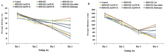 Interestingly, the hippocampus is an important structure in rats and humans, and it plays a crucial integrative role in learning and memory [56]. As a result, hyperglycemia-induced alterations in the structure of the hippocampus may represent the pathological basis of cognitive deterioration in diabetic rats [57]. Our behavioral analyses demonstrate that HFD/STZ induction prolonged escape latency and distance in MWM training, indicating spatial learning deficiencies. CurNP and ZnONP treatments reduced the escape latency and distance of model rats, protecting them against HFD/STZ-induced spatial learning impairments. In the probe trial, shorter times spent in the target quadrant and fewer platform zone crossings were seen in model rats, indicating impairments in spatial memory. CurNP and ZnONP treatments protected the spatial memory of model rats; they spent more time in the target quadrant and crossed the platform zone twice more. Our study suggests that CurNP and ZnONP may protect the spatial and memory functions in the T2DM rat model.