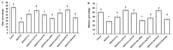 Effects of ZnONP and CurNP on memory impairment in rats. The Morris water maze (MWM) was used to test rats’ memories by measuring (A) escape latency and (B) escape distances. A probe test was used to analyze the maintenance of memory in the MWM by measuring the percentage of (C) time spent and (D) distance swum in the target quadrant. Three independent experiments were performed. Data are expressed as mean ± SEM (n = 8); means with different letters (a–e) in each bar are significantly different (p < 0.01), in Figure 2C the largest data value take the letter (a) and the smallest data value take the letter (e) and in Figure 2D the largest data value take the letter (a) and the smallest data value take the letter (c).
