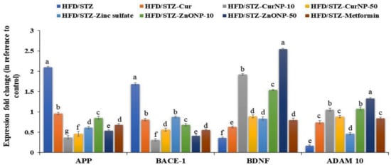 As it happens, the administration of CurNP and ZnONP significantly downregulated the expression of APP and BACE-1. In addition to this, they decrease the Aβ-42 levels and significantly elevate the IDE concentration in the hippocampus of rats, with the maximum effective results, compared with curcumin, zinc sulfate, and metformin. Numerous earlier studies have shown that natural antioxidants, such as CurNP, prevent neuronal death occurring in AD, and lead to a reduction in Aβ plaque deposition [24]. These results were linked with a marked upregulation of gene expression of BDNF and ADAM-10, providing a new strategy for attenuating neurodegeneration developed in T2DM [82].