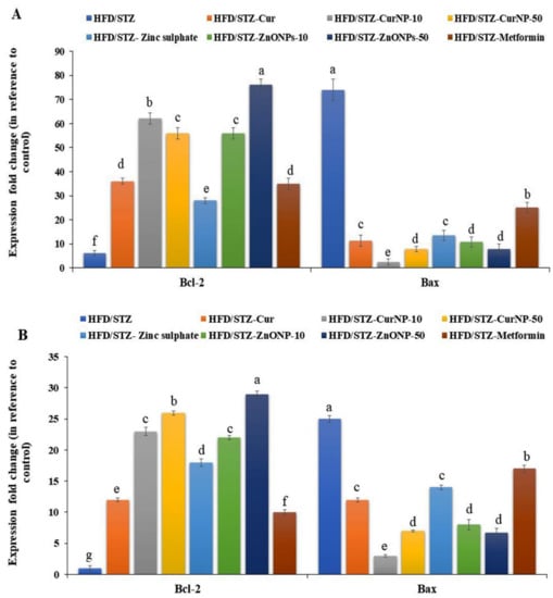 Further, the anti-apoptotic Bcl-2 and pro-apoptotic Bax are two critical molecules involved in cell death [75]. The enhanced expression of Bax and decreased expression of Bcl-2 following the HFD/STZ induction observed in the current study suggest that neuro-apoptosis is elevated by T2DM induction in the hippocampi and cortices of induced rats. The equilibrium of the antiapoptotic (represented by Bcl-2) and pro-apoptotic (represented by Bax) molecules were significantly changed post-treatment with CurNP and ZnONP, which effectively inhibited apoptosis in the hippocampus and cortex and increased neuronal survival. Further studies of the apoptotic pathways like caspase(s) and cytochrome c are needed to determine their involvement in our pathway, like the mitochondrial-dependent intrinsic apoptotic pathway, as reported in other studies [76].