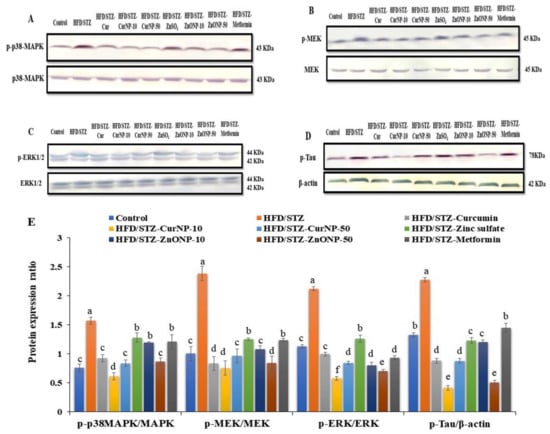It has been reported that the MAPK pathway, p38, ERK, and MEK activate many signaling cascades including inflammation and apoptosis. Consequently, we here examined the protein phosphorylation levels of MAPK signaling in the hippocampus of rats by western blotting. As shown in Figure 5, the levels of phosphorylated-p38MAPK, phosphorylated-ERK 1,2 (p-ERK), and phosphorylated-MEK (p-MEK) in rats with type 2 diabetes-induced neurodegeneration were increased significantly compared with the control group (p < 0.01). After CurNP and ZnONP treatment, the phosphorylation levels of p-p38MAPK, p-ERK, and p-MEK were markedly decreased compared with those of the untreated group (p < 0.01). Our data indicated that 10 mg/kg CurNP or 50 mg/kg ZnONP might be associated with the regulation of neuroinflammation and apoptosis in the hippocampus of type 2 diabetes-induced rats at least partly, by adjusting the activation of the MAPK signaling pathway. Additionally, type 2 diabetes-induced rats revealed significant hyperphosphorylation of tau proteins when compared with the control rat group (p < 0.01). Interestingly, this elevation was markedly suppressed following administration of all current treatment options to model rats, with marked inhibition of tau phosphorylation observed in groups treated with 10 mg/kg CurNP or 50 mg/kg ZnONP (Figure 5A–E).