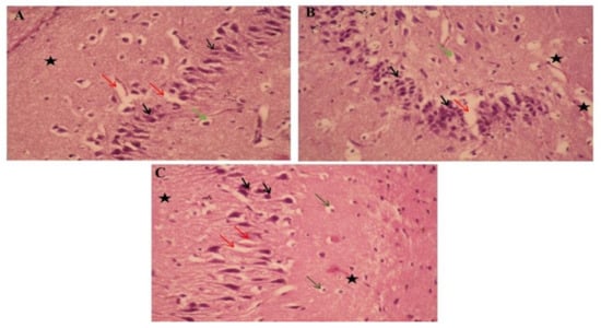 The fixed brain tissues in 10% formalin were processed for dehydration in ascending grades of alcohol, followed by impregnation. The specimens were then embedded in paraffin and allowed to solidify at room temperature. Using a rotatory microtome, serial sections of 5 μm thick were cut. After that, sections were stained with Haematoxylin and Eosin (H&E) and observed for histopathological changes.
