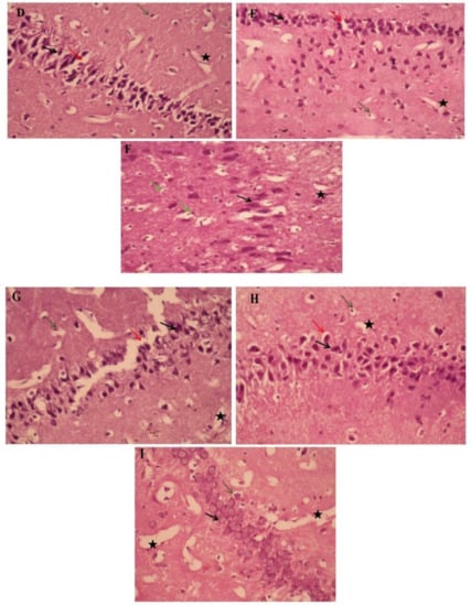 The effects of ZnONP and CurNP on the histology of hippocampi in rat groups. Hippocampi of rats were evaluated via hematoxylin-eosin (H&E) staining at 400 X magnification. (A) The control group: a photomicrograph of the hippocampus showing arranged pyramidal cells (black arrows) with minimum vacuolated cytoplasm (Red arrows), a few pyknotic neuropil cells (Green arrows), and homogenous brain tissue (black asterisk). (B) Untreated HFD/STZ-induced group: a photomicrograph of the hippocampus showing marked proliferating pyramidal cells with dark nuclei (black arrows) with minimum vacuolated cytoplasm (red arrows) and many pyknotic neuropile cells (green arrows), and reduction of the myelinated sheath (black asterisk). (C) HFD/STZ-induced rats treated with curcumin: a photomicrograph of the hippocampus showing some pyramidal cells with hyperchromatic nuclei (black arrows) and marked vacuolated cytoplasm (red arrows) and many neuropile cells (green arrows), with mildly dilated and hemorrhaged blood capillaries (black asterisk). (D) HFD/STZ-induced rats treated with CurNP-10: a photomicrograph of the hippocampus showing normal features of many neuropil cells and few pyknotic ones (green arrows), mildly proliferating pyramidal cells with hyperchromatic nuclei (black arrows) and mildly vacuolated cytoplasm (red arrows) with homogenous brain tissue (black asterisk). (E) HFD/STZ-induced rats treated with CurNP-50: a photomicrograph of the hippocampus showing pyramidal cells having dark pyramidal nuclei (black arrows) and mildly vacuolated cytoplasm (red arrows) with few necrotic ones (green arrows) and homogenous brain tissue (black asterisk). (F) HFD/STZ-induced rats treated with zinc sulfate: a photomicrograph of the hippocampus showing some pyramidal cells with hyperchromatic nuclei and homogenous cytoplasm (black arrows), many neuroglial cells (green arrows), with mildly degenerative myelinated sheaths (black asterisk). (G) HFD/STZ-induced rats treated with ZnONP-10: a photomicrograph of the hippocampus showing pyramidal cells, dark pyramidal nuclei (black arrows) and low vacuolated cytoplasm (normal architecture) (red arrows), prominent nucleolus (green arrows), and markedly hemorrhaged dilated blood vessels and edema (black asterisk). (H) HFD/STZ-induced rats treated with ZnONP-50: a photomicrograph of the hippocampus showing hyperchromatic nuclei (black arrows) with mild vacuolated cytoplasm (red arrows), and pyknotic pyramidal (green arrows), with the area of homogenous brain tissue (black asterisk). (I) HFD/STZ-induced rats treated with metformin: a photomicrograph of the hippocampus showing many prominent nucleoli (green arrows), pyknotic pyramidal cells (black arrows), and reduction of myelinated sheaths in the necrotic area (black asterisk).