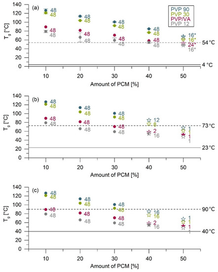 Summary of the glass transition temperature (Tg) values of ASDs and the stability results obtained by powder X-ray diffraction (XRD) measurement. The stability test was conducted under three different storage conditions: (a) storage at 4 °C without humidity control, (b) storage at 23 °C/75% RH, and (c) storage at 40 °C/75% RH. Tg: The Tg were determined directly after the production of ASDs and are reported as the average ± SD, n = 1–2. For clarity, the Tg error bars are shown in Figure 1a only. The solid lines indicate the storage temperature, and the dashed lines indicate the temperature 50 °C above the storage temperature. XRD: The XRD results are shown as circles and stars. Circles represent the amorphous state; the numbers indicate the weeks in which the ASDs were still amorphous. Stars represent three types of recrystallization. Open stars show recrystallization in polymorphic form I. Closed stars show recrystallization in polymorphic form II. Semi-closed stars represent recrystallisation in both form I and form II. The numbers indicate the weeks in which recrystallization was detected in the XRD measurements. Numbers with *: initial XRD analysis was carried out 16 or 24 weeks after preparation. Recrystallization may therefore have occurred earlier.