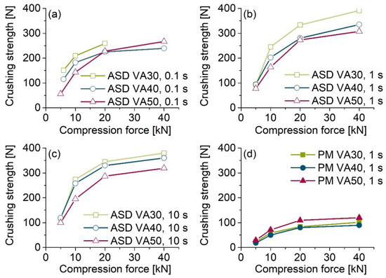 Crushing strengths of ASD and PM tablets with MCC 200 directly after preparation as a function of compression force. The ASD tablets were compressed with three different dwell times: (a) 0.1 s, (b) 1 s, (c) 10 s, and (d) PM tablets compressed with a dwell time of 1 s. Due to the small sample quantity, measurements were performed once per sample.