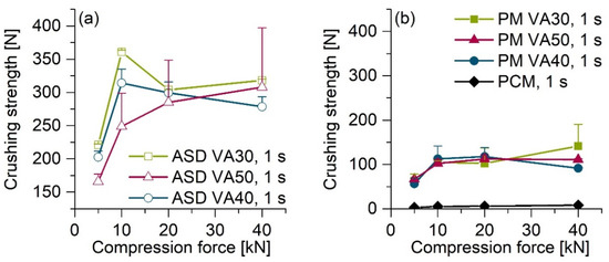 Crushing strengths of pure ASD and PM tablets without MCC 200 directly after preparation as a function of compression force: (a) pure ASD tablets compressed with a dwell time of 1 s, (b) pure PM and PCM tablets compressed with a dwell time of 1 s; average ± SD, n = 2. For clarity, only the upper error bars are displayed.