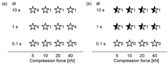 Stability of ASD tablets VA40 with MCC 200 during storage under two different conditions: (a) 23 °C/75% RH, (b) 40 °C/75% RH. Stars represent two types of recrystallization. Open stars show recrystallization in polymorphic form I. Semi-closed stars represent recrystallization in both form I and form II. The numbers indicate the weeks in which recrystallization was detected in the XRD measurements.