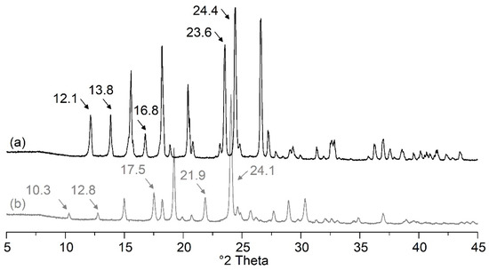XRD diffractograms of PCM of different polymorphic forms. The arrows and numbers indicate the position of the characteristic diffraction peaks of each modification. (a) polymorphic form I, (b) polymorphic form II.